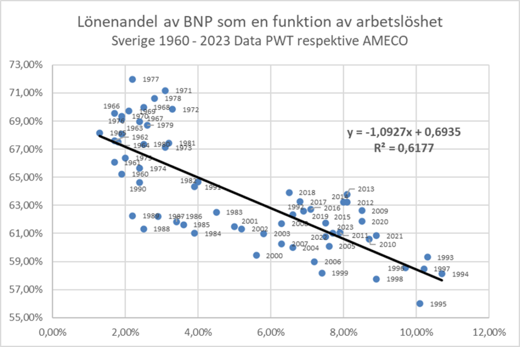 Som framgår av ekvationen i det nedre diagrammet är trendkurvans lutning β ≈ – 1,1 vilket innebär att en procents ökning av arbetslösheten samtidigt innebär en procent mindre av BNP till löner.